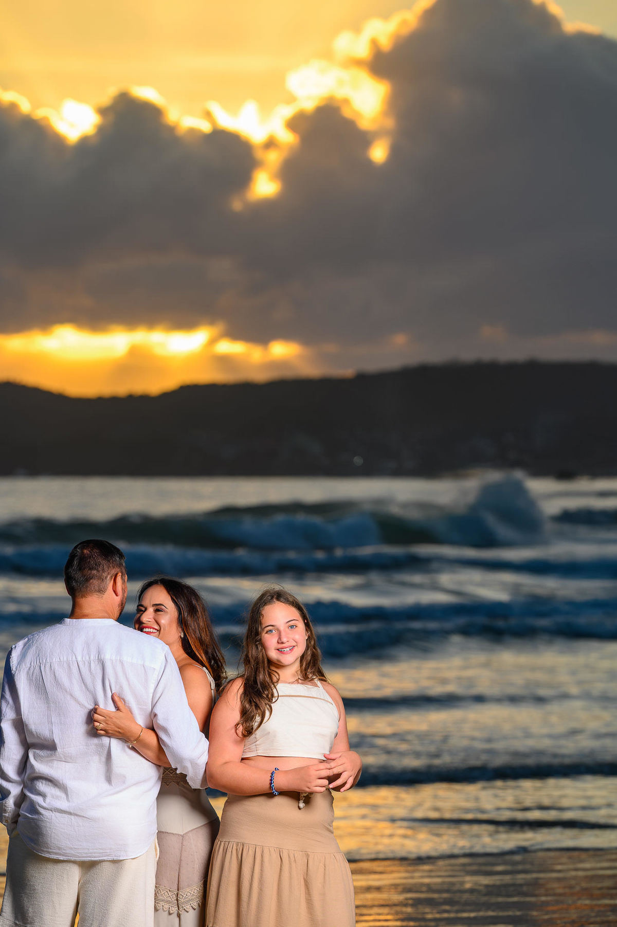 Escolhemos a praia como cenário justamente por trazer essa atmosfera leve e natural. O ensaio aconteceu em um horário de luz mais suave, o que ajudou a criar um clima acolhedor, com cores mais quentes e uma sensação de fim de tarde que combina muito com fotografias em família. A proposta foi conduzir o mínimo possível, deixando que as interações acontecessem de forma espontânea.